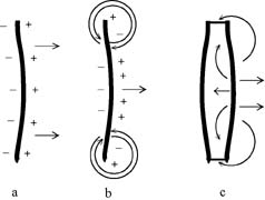 Знаки плюса показывают зону увеличения воздушного давления, а минуса - уменьшения (a). При смешении воздуха обеих зон наступает акустическое короткое замыкание. Звуки высоких частот смешиваются мало, однако длинные волны низких частот огибают поверхность деки и взаимоуничтожаются (b). Одна из важнейших задач корпуса скрипки - это ограничить нежелательное смешение разнофазовых волн (c).