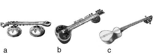 С акустической точки зрения восьмеркообразная форма музыкального инструмента должна рассматриваться как объединение двух резонаторов в один. Древние мастера иногда практиковали объединение в одном инструменте двух резонаторов. Так индийский струнно-щипковый инструмент вина имел два тыквенных резонатора под грифом (рис.3, а). Ситар тоже имел два резонатора из тыквы, но один являлся основным корпусом инструмента, а второй, меньшего размера, крепился в верхней части шейки (рис.3, b).