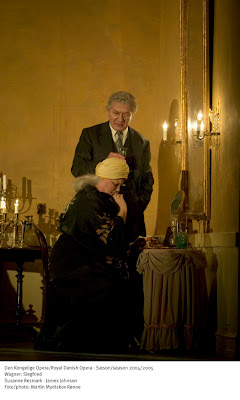 В крыльях огня появляется стеклянный мавзолей Брюнхильды. После появления Зигфрида, красное зарево сменяется синевой лунного света. Брюнхильда лежит, укрытая черными крыльями. Зигфрид прячется от проснувшейся тёти, которая не только основательно выспалась, но и загорела, судя по гриму. Да и волосы отросли до колен. Безумно интересно поведение пробудившейся тети, которая с таким любопытством и осторожностью начинает отговаривать Зигфрида от секса, словно боится, что он и в самом деле может поддаться на её уловки и согласиться остаться с тётей "друзьями". В таком исполнении эта несговорчивость Брюнхильды становится последним испытанием для Зигфрида, логично завершающим цепь свалившихся на мальчика проблем. То, с каким восторгом тётя слушает отказ племянника от платонических отношений, не оставляет сомнений в справедливости именно такого понимания мотивов поведения Брюнхильды. Однако, как я уже отмечал в связи с «Валькирией», кастинг в доступной для анализа видеозаписи настолько комичен, что серьезность режиссерской работы балансирует на грани водевильного фарса. Так Ирена Теорин, обладающая роскошными плотными верхами, своими ужимками напоминает одновременно Сову из советского мультфильма про Винни-Пуха и тётушку Чарли в исполнении Александра Калягина. Стиг Андерсен, исполнивший в этой записи Зигмунда и «обоих» Зигфридов, тоже юношеской убедительностью не отличается, местами напоминая Аркадия Райкина, но играет и звучит певец отменно, и если бы не возрастное брюшко, издали мог бы вполне сойти хотя бы за тридцатипятилетнего «мальчугана». Оба нибелунга – Бенгт-Ола Морни и Штен Бирил, - как и в "предыдущих сериях", достойны всяких похвал, а Вотан Джеймса Джонсона драматически ярок и вокально безупречен, и вместе с Эрдой является одним из самых удачных режиссерских решений (хотя оба нибелунга - всё еще ярче по своим типажам).