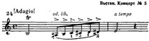 При исполнении длительных последовательностей staccato volant Д. М. Цыганов советует применять «косое» ведение смычка как бы несколько «из-за спины».