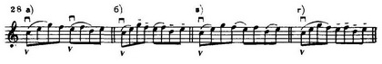 Однако если у человека нет физиологических или психических дефектов, то практически каждый обладает потенциальной возможностью овладения любым штрихом. Все штриховые движения состоят из совокупности подчас элементарных, подчас более сложных движений, заложенных в. функциональных возможностях организма. Следовательно, их не нужно специально вырабатывать, а желательно лишь тщательно выверить, отточить и психологически подчинить своей воле. Неудача в исполнении штриха происходит обычно либо or нецелесообразного способа изучения, физиологически неправильной постановки, либо от того, что скрипач не нашел способа управления определенным движением своего организма.
