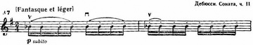 При исполнении штриха в более быстром темпе необходима пульсация локтевой мышцы совместно с колебаниями кисти при поступательном горизонтальном проведении смычка. Пульсацией правой руки следует как бы поддерживать и продолжать те рикошетные колебания, которые возникают в трости смычка, — тогда на исполнение штриха затрачивается минимальная энергия и «летучее» staccato становится легким и изящным.
