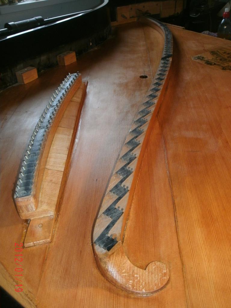 Вчера осматривал штеги у ремонтируемого рояля Ратке и подивился тщательности и сохранности работы. Штеги, без практически потерь очень тщетельно продуманные и исполненные, являются практически эталонными при своём более чем столетнем существовании. Басовый штег не оторван и трещины есть только в мостике - переходной дощечке от лейстика на деке к собственно штегу. В данном случае эти трещины не вижу смысла заделывать, тем более вскрывать всю конструкцию.
