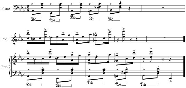 В традициях исполнения рэгтайма правая педаль используется чрезвычайно мало-если вообще; и всегда для левой руки,чтобы связать бас с аккордом: бас всегда длится до короткого аккорда,словно нож обрезающая его.В типичном метре 2/4(фактически 4/акценты в левой руке падают на СИЛЬНЫЕ восьмушки ,и это в отличие от свинга,где акцентируются слабые 2-я и 4-я четверти.Желательно учить басы левой рукой как самостоятельную мелодию; играть их только пятым пальцем,а в аккордах 5-ый палец не использовать.(см.пример)