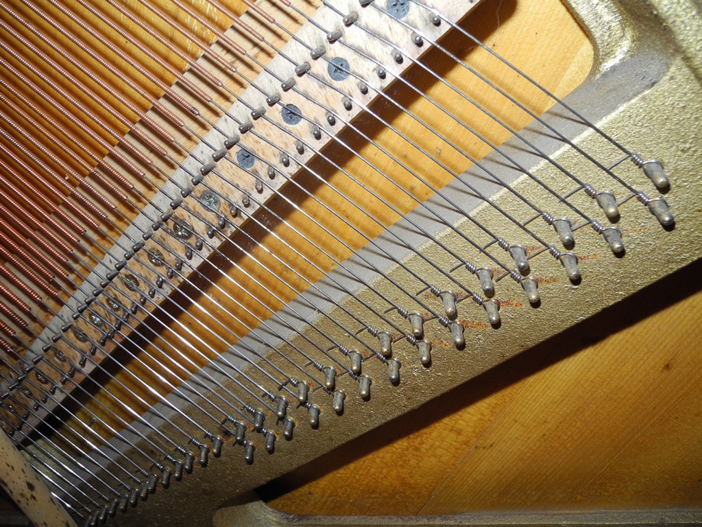 То что стоял инструмент во влажном не проветриваемом помещении, быстрее всего подвале - это точно. Видно, что порвало деку, поразлетались штеги, отклеились рипки. Какой то Кулибин пытался это поправить. Деку не реил (слава Богу) а вот над штегами и рипками поиздевался. От сырости набухла и конечно же отошла накладка на басовом и частично теноровом штегах. Вместо того, чтоб снять штифты и либо вытягивать струбцинами, либо изготовить новую накладку, горе-мастер стал выжимать ее шурупами через штифты. Поэтому их и понадобилось 20 шт. на 30 см. при чем косо-криво да все разные. Наверняка ничего хорошего с этого не вышло. Я подозреваю, что с теноровым та же картина, просто прихватил он только там где мог достать. Одним словом нужно проверять сейчас все клеевые соединения. То, что Вы сможете сделать сами - поиграйте медленно но на резкой атаке хр. гамму и послушайте нет ли щелчков стуков и т.п. Если есть - пишите, подскажем где искать.