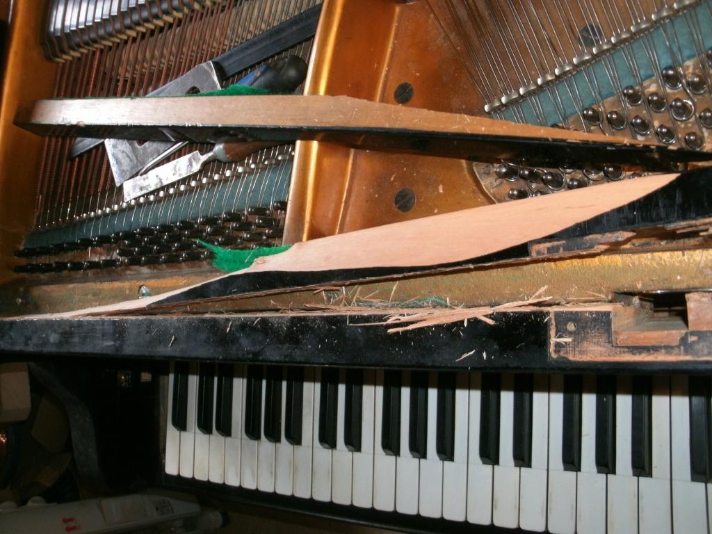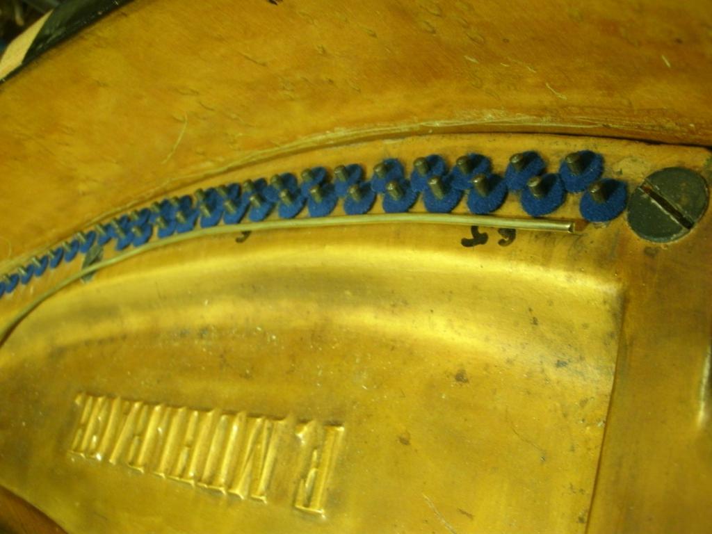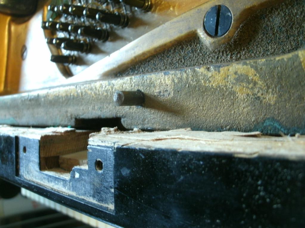 А претензий, по сути две- к этому перелому и не оч. точно выставленным молоткам на фабрике- чему и свидетельствует странная выборка рамы в дисканте.Пыль, кстати похоже что изначальная была в нём, несмотря на предыдущий ремонт. Мензура струн удивительная, видимо творчески переделанная, на штеге другие данные .