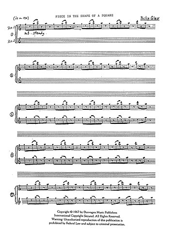 «Музыка в форме квадрата» ("Music in the Form of a Square") никак не связано с «Черным квадратом» Казимира Малевича. Сочинение лишь отражает исполнительский ритуал, предписанный композитором. В исполнении участвуют два флейтиста. Оба они передвигаются вдоль образующих квадрат нотных пюпитров (один – внутри квадрата, другой – снаружи), играя поставленные на пюпитры тексты.