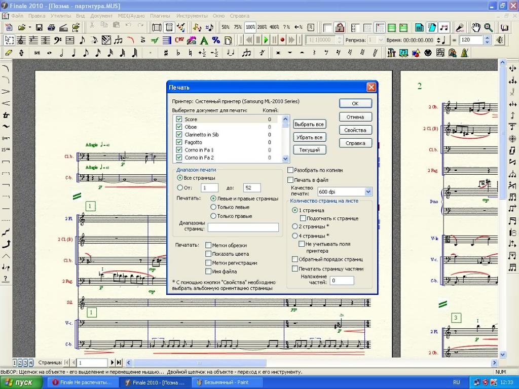 Почему-то перестало распечатывать один из файлов в Finale 2010, не могу понять почему,в настройках не менял ничего.