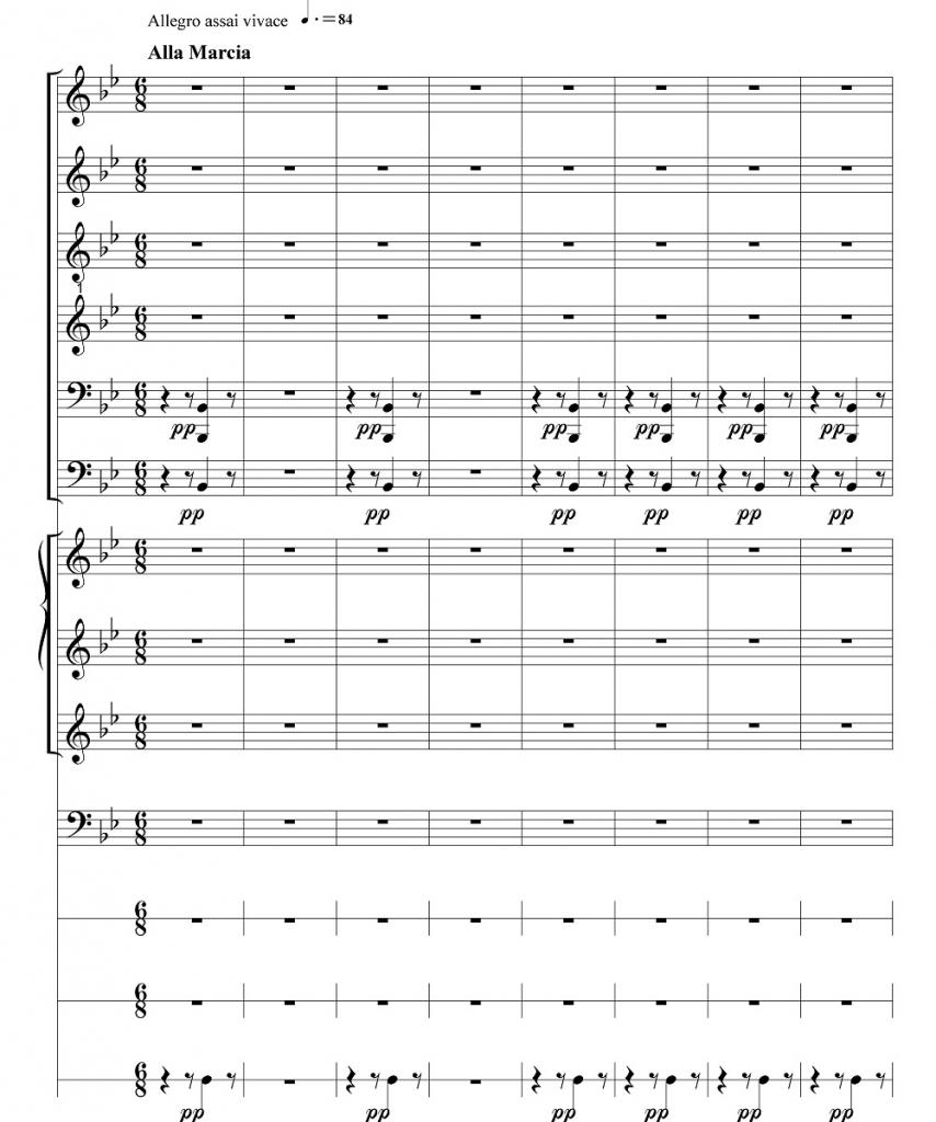 Совершенно очевидно, что здесь никакие средства, за исключением жеста дирижера, не могут помочь слушателю, не знающему нотный текст, т.е. занимающему пассивную позицию, воспринять метрическую и ритмическую форму происходящего. Инерция метрического восприятия здесь не действует, потому что это начало нового раздела формы. Попробуем учесть основные элементы текста этого отрывка. Бетховен задает здесь прежде всего темп, выраженный в традиционной итальянской терминологии, дополненной метрономическим указанием и указанием на жанр, имеющий для Бетховена конститутивный смысл: Alla Marcia. Что касается метронома, то известно, что Бетховен распространял его действие только на ориентацию в темпе в самом начале произведения (известное примечание Бетховена к одной из своих песен). Затем Бетховен указывает структуру такта, основной размер — 6/8. Указание Alla Marcia выделяет бинарность (на дирижерском сленге «на два») как основную форму пульса. Таким образом, композитор задает основную структуру незвучащего пульсационного континуума, подчеркнутую впечатляющим видом насквозь паузированной партитуры. И для внимательного читателя, и для дирижера, имеющего дело со всеми элементами процесса, эта энергетически напряженная «вакуумная» структура является абсолютно реальной еще до всякого звучания. На этот задаваемый всем понятийным и визуальным рядом континуум Бетховен бросает звучащие элементы, которые сразу вступают в конфликтные взаимоотношения с пульсационной структурой сначала на уровне внутритактовом: все эти 12 тактов до вступления деревянных духовых звучащий ряд ни разу не совпадает с сильной долей (совершенно как у Веберна в конце Вариаций ор. 27).