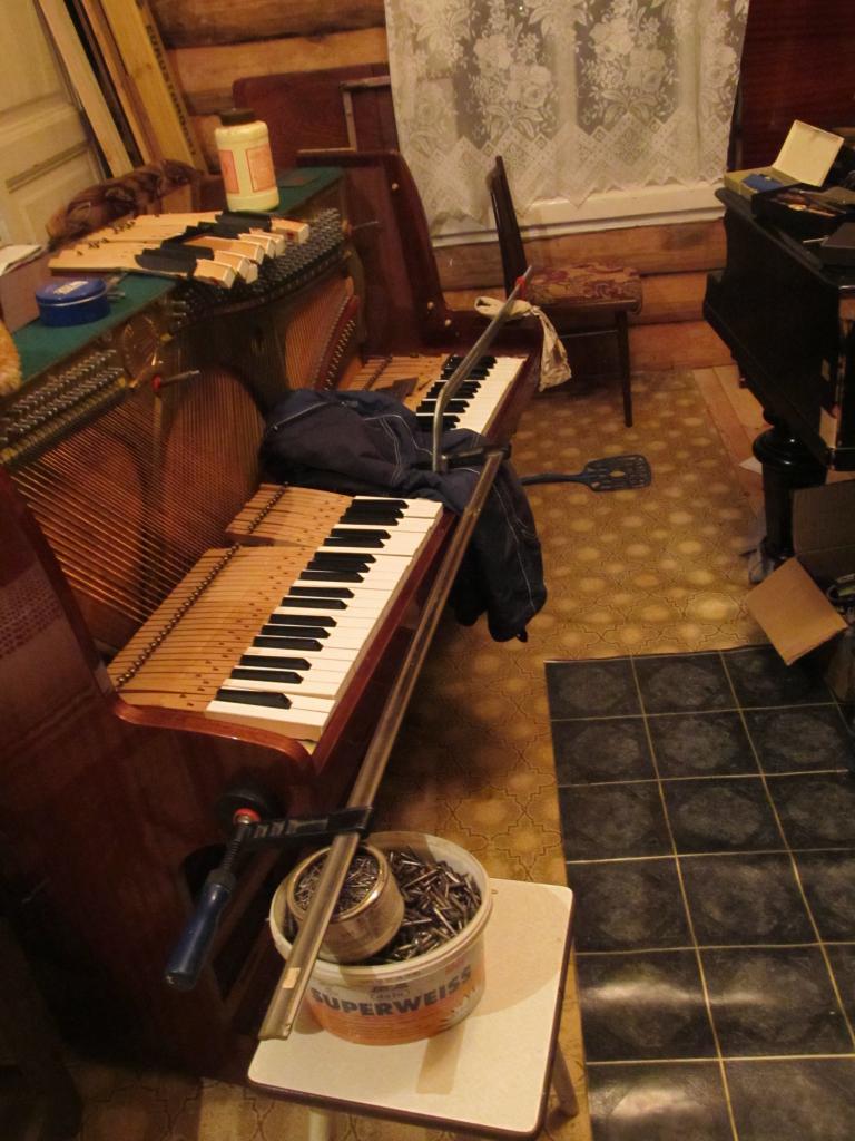 Попало мне на ремонт пианино Циммерман.Звучит пианино ярко,сочно,как многим нравится.Поначалу казалось,что проблема лишь в колках 6,70Х60 без нарезки,которые не держат как надо. В результате пришлось приклеить рипки,стянуть корпус( хорошо,пара больших струбцин в этом помогла).Когда все сделал,увидел,что шпрейц отстал внизу,а притянуть его мешает муфта между ним и средним рамным отверстием.Пришлось вынуть шуруп,выпилить муфту и стянуть без оной,как обычно. Также отсутствовали шайбы на деке сзади,на фото уже есть новые.Вложение 85083Вложение 85084Вложение 85085Еще один пример странных и вредных изменений конструкции пианино с родины Ангелы Меркель.Вложение 85064Вложение 85066Вложение 85067Вложение 85069Вложение 85072Вложение 85074Вложение 85077Вложение 85078Вложение 85079Вложение 85080Вложение 85081Вложение 85082