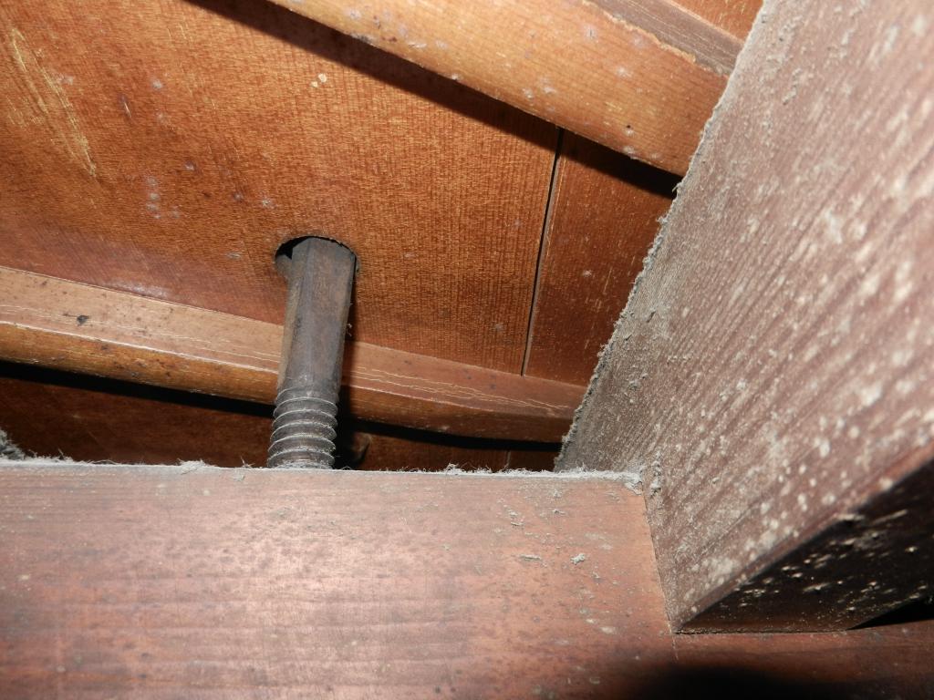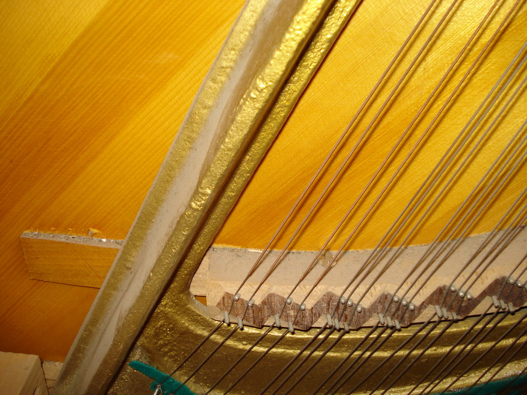 Так выглядят трещина в деке и отклейка от неё рипки сзади пианино. В данном пианино ничуть на звуке не сказалось. А бывает и совсем наоборот.