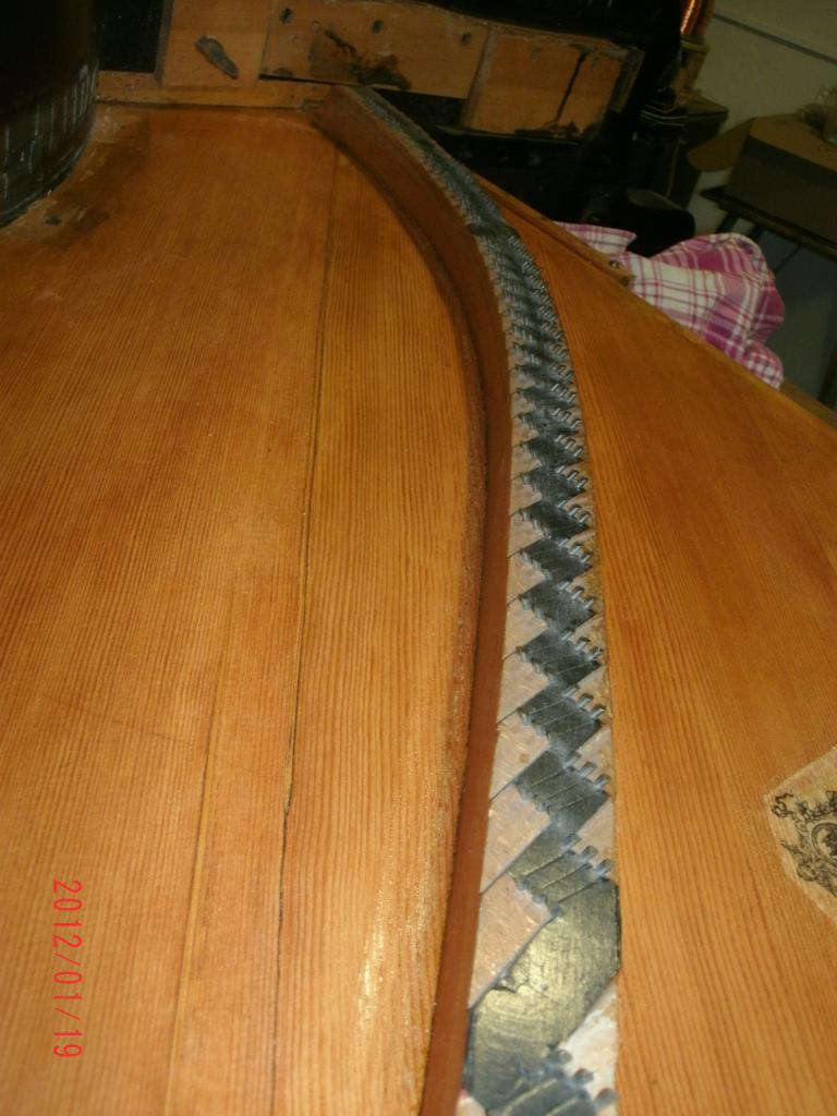 3.У меня такое впечатление, что про звук Ратке знал все или почти всё.На этом небольшом рояле дека толстая, 10.5-11мм С огромной прорезью около окончания дискантового и за басовым штегами.Так понимаю, это позволяет смягчить переход между гладкими и витыми струнами. Мало того , последний хор гладких струн рассчитан на витые - так делаюют, если конец гладких "бочковат" по звуку - меняют последние хоры на витые. Обычный приём для маленьких пианино и роялей.