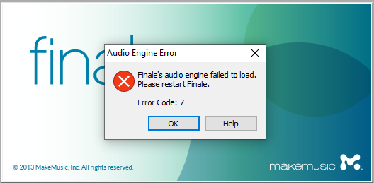 Уважаемые коллеги, не сталкивался ли кто-нибудь с ошибкой audio engine error (7) в Финале 2014? Finale14_Audio Engine Error.PNG