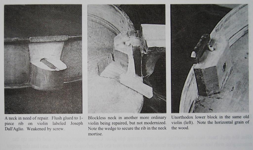 Способ крепления шейки (это не клотц, а шейка пропилена, и в пропилы вклеены обечайки). У обечаек клотцы отсутствуют. Кто-нибудь может прокомментировать? Инструмент выдается за начало 20 века, Вена.