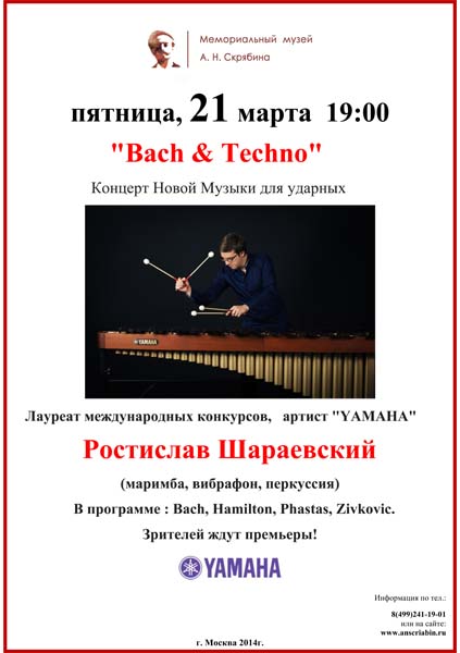 Произведения Баха, Гамильтона, Фастаса и Живковича прозвучат в необычном переложении на маримбу, вибрафон и перкуссию. С 2000 года Ростислав Шараевский исполняет все свои программы на инструментах японской фирмы «Yamaha».
