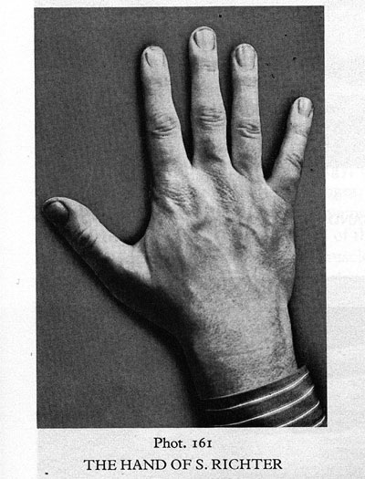 Насчет рук Рихтера Мацуев заблуждается. На форуме руки Рихтера обсуждались и даже фотография выкладывалась. Сейчас постараюсь найти. Вот нашел:У Рахманинова были огромные руки. У Листа – тоже. А вот у Рихтера – малюсенькая ручка.