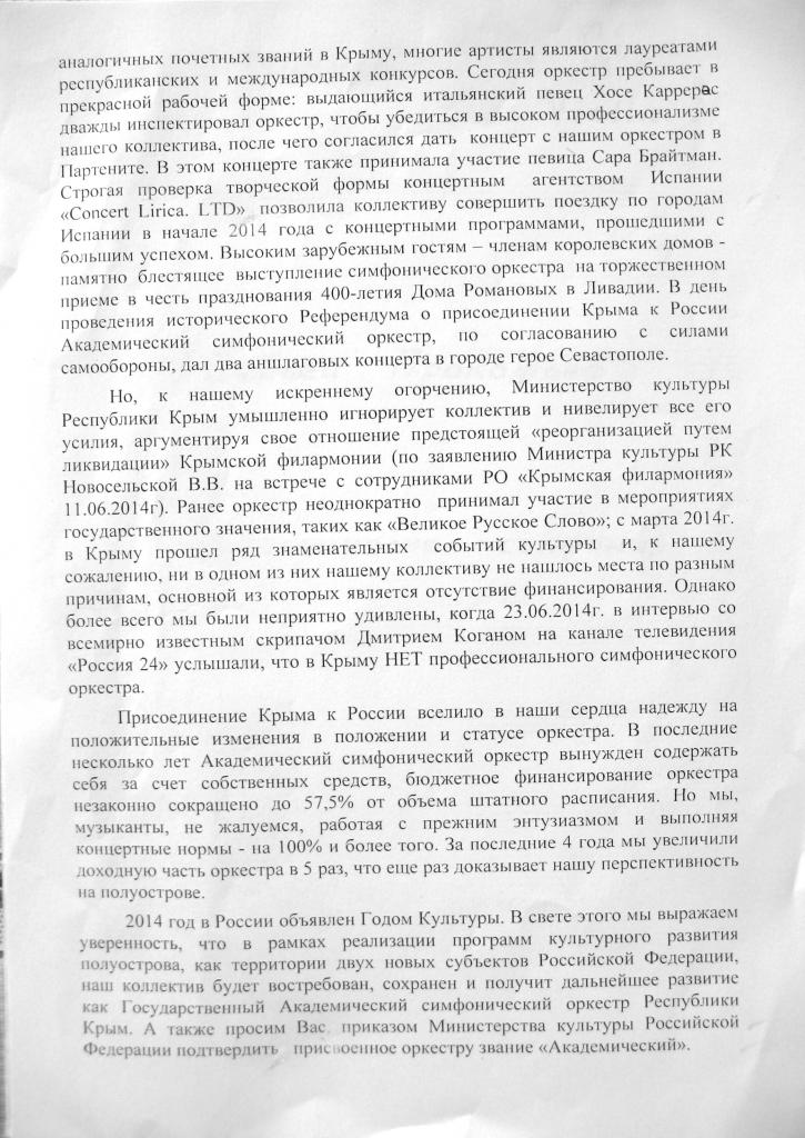 По предварительным данным, в декабре 2014 г. в Республике Крым, вошедшей в состав РФ весной 2014 года, будет ликвидирован единственный в Крыму Академический симфонический оркестр (базирующийся в Ялте с 1937 года), Лауреат Всесоюзного конкурса, более 80 человек музыкантов. Обращения администрации оркестра в Министерство культуры РФ с нижеследующим текстом