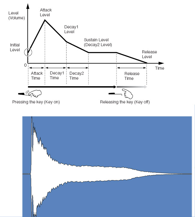 Вот вам две картинки, верняя, общий случай звука, взял с инструкции для моего синтезатора Yamaha, вторая нижняя картинка - звук одной записанной ноты фортепиано. Как видно нижняя картинка является частным случаем общей схемы. Форма конечно будет меняться в зависимости от силы нажатия, длительности нажатия, педель, нота, но в целом будет примерно так как на картинке.