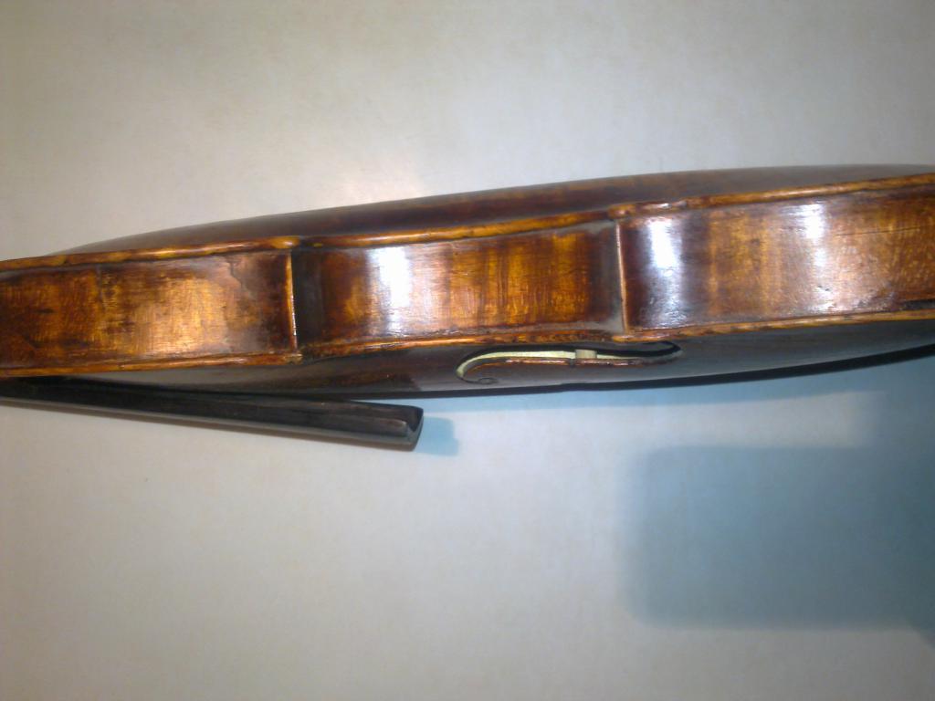При плохом качестве фотографий, подумалось, что это все-таки 17 век (голова врезана - думаю, что это не имитация), Брешия. Возможно Маджини. Лак в основном оригинальный, только в некоторых местах подретуширован. Кусок в нижней деке с вырезанной скульптуркой взят из подобной же скрипки, но другой - крыло справа по рисунку не совпадает с основной скульптуркой. Может быть эта вторая скрипка была полностью разрушена, если реставратор позаимствовал у нее Феникса, тогда как первая скрипка пострадала меньше, т.е. потеряла именно Феникса. Верхняя дека очень сильно изношена - много трещин.