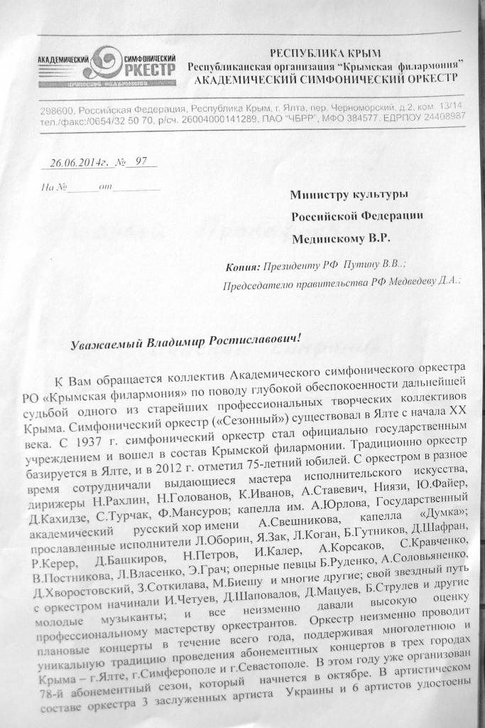 По предварительным данным, в декабре 2014 г. в Республике Крым, вошедшей в состав РФ весной 2014 года, будет ликвидирован единственный в Крыму Академический симфонический оркестр (базирующийся в Ялте с 1937 года), Лауреат Всесоюзного конкурса, более 80 человек музыкантов. Обращения администрации оркестра в Министерство культуры РФ с нижеследующим текстом
