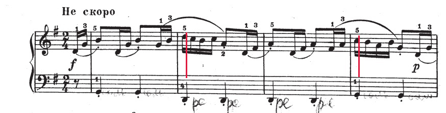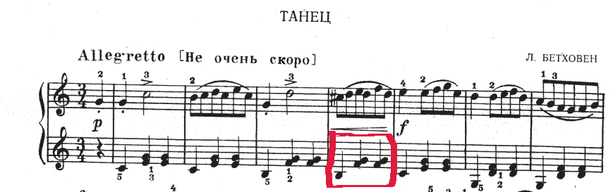 Друзья! Вот ноты. Из самоучителя Зиминой и Мохеля по фортепьяно, называется "Контрданс-экосез". Как играть правой рукой? Красной линией я провёл ноты к левой руке и видно что они нормально так не совпадают. Печать? Такая картина в изданиях 68-го года и в современном. Сижу вот, ломаю голову. Картинку с нотами прикрепить не могу потому, что прикреплятель картинок врёт, что файл не является изображением, потому просто дам на неё ссыль. Спасибо, кто откликнется.