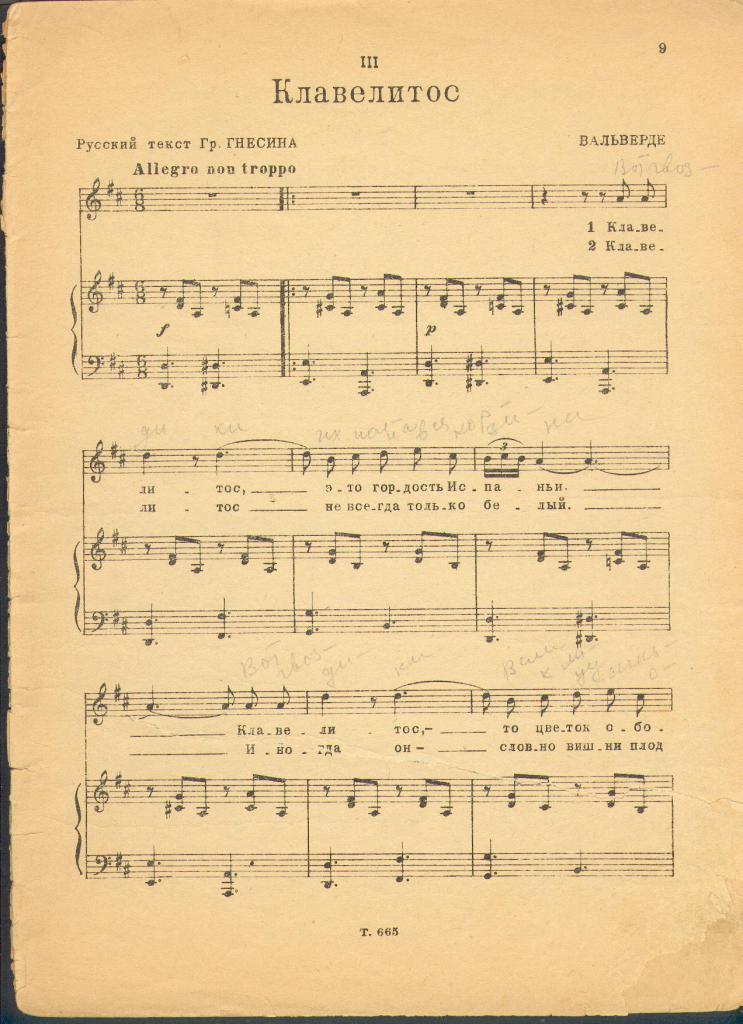 Милая soprano2! В любом случае ОГРОМНОЕ СПАСИБО! Только в том варианте, который я слышал ранее, припев, а не запев, начинается со слов " Клавелитос, Клавелитос..." - пел тенор с народным оркестром то ли Осипова, то ли телевидения и радио, но очень здорово звучало!... Припев бы я смог бы наиграть , или напеть, но поможет ли это? Правда в Ваших нотах есть автор-это уже много.... Спасибо Вам!
