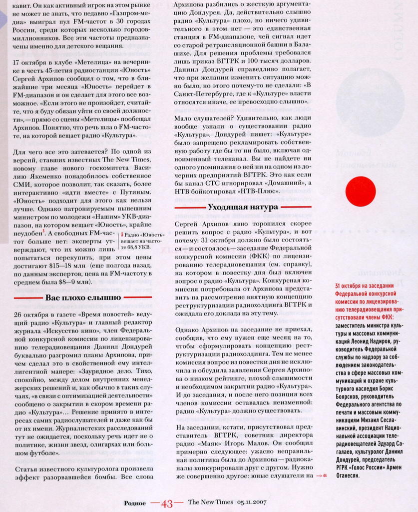 А насчет ТК "Культура" - очень банально. Люди постоянно забывают о том, что черный и белый цвета в чистом виде в природе не встречаются. Между MTV (как, якобы, идеала молодежного ТВ, хотя тут есть сомнения) и "страшной скучищей" есть масса всяких нюансов, которые "молодежь" вполне готова воспринять, если бы кто-то этим озаботился. А такими формулировками маскируется отсутствие воображения и нежелания что-то делать и вступать но скользкую почву экспериментов.