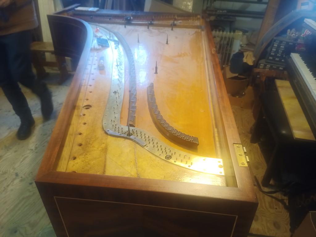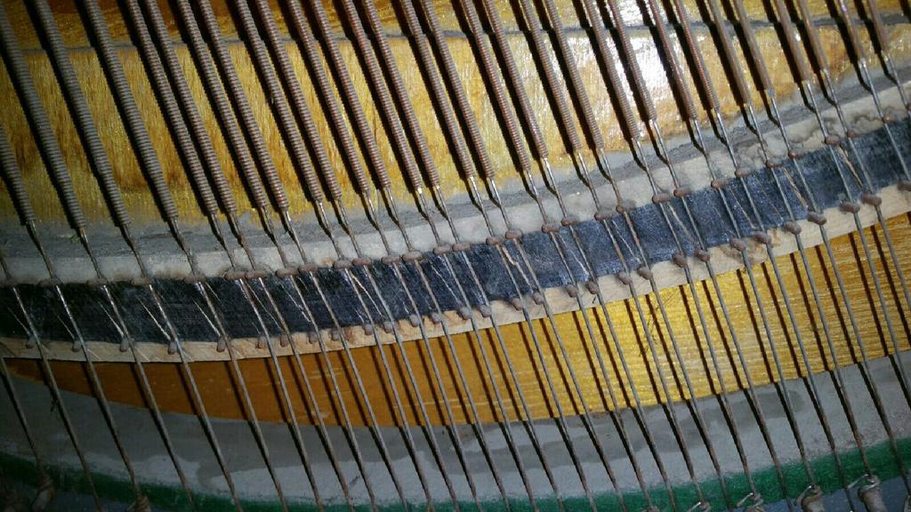 В данном рояле был превышен перелом струн, что зажало деку , вдавило ее в басовой части и зажало звук в правой части дисканте. При том , что остальное было выполнено достаточно аккуратно - мензура струн ( кроме замененных некоторых басов на современной стали).