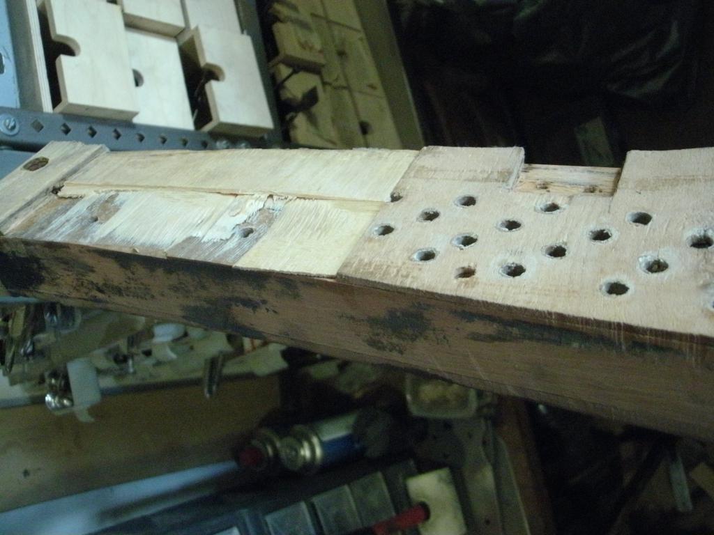 У меня довольно- таки убедительная просба - не притягивать к этой весьма неоднозначной теме фото, не имеющие к ней отношения. Расскажу поэтому подробнее. Вирбельбанк на фото переломился пополам из-за грубейшего брака. Несущий долевой слой сделан из некондиции и склеен под углом встык. Да и клей на "Октябре" разбавляли без зазрений совести. Сужу по вечно отпадающим пианинным стенкам, фанеровке и "саморазборным" вирбельбанкам. Так что это к теме про вечно поруганный Беккер, не иначе Тему читают музыканты и потенциальные клиенты, и у них может по незнанию сложиться мнение... Вот тут бы какое- нибудь душераздирающее фото с подписью:"Рояль с установленными накануне запрещенными международными конвенциями пробками взорвался, нанеся хозяйке травмы, несовместимые с жизнью". А то все как-то по поверхности, а глубже не ныряется. Ох,, до чего ж я дотошный, особенно по приводимым фото. Это я еще про предыдущие фото. Ну какая там скрытая установка пробок? Фото же сделаны с обеих сторон детали. А каким способом можно скрыть пробки в инструменте с панцирной рамой, да еще с "лица" в/б? И тут что-то не стыкуется. Видны только 2 пробки в месте крупного дефекта. Достаточно посмотреть на направление слоев в отверстиях.