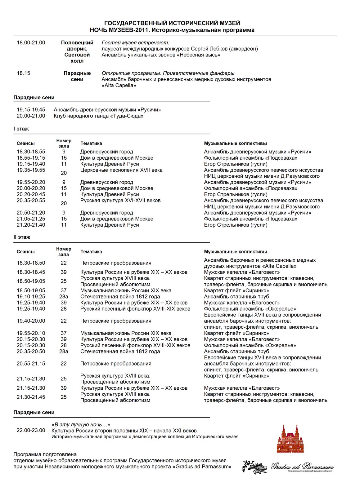 Финальной точкой мероприятия станет концерт в Парадных сенях, во время которого на плазменных экранах будут демонстрироваться уникальные по красоте экспонаты из фондовых коллекций Исторического музея. Начало концерта в 22.00.