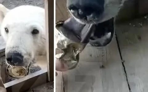 Люди спасли белого медведя от застрявшей в пасти банки из-под сгущенки