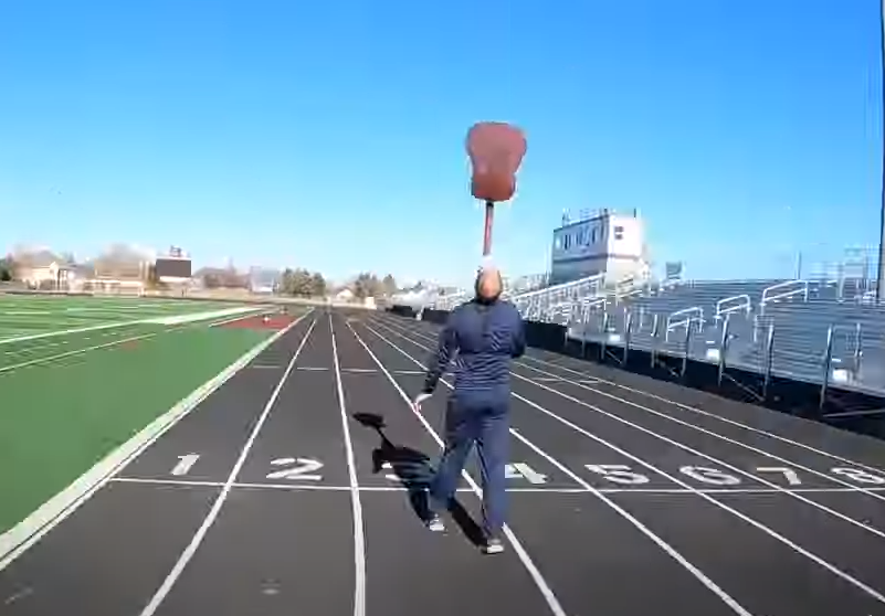 Суммарно он прошел 13 полных кругов по стадиону для бега. Завершить свое шествие ему удалось за 1 час и 7 минут.