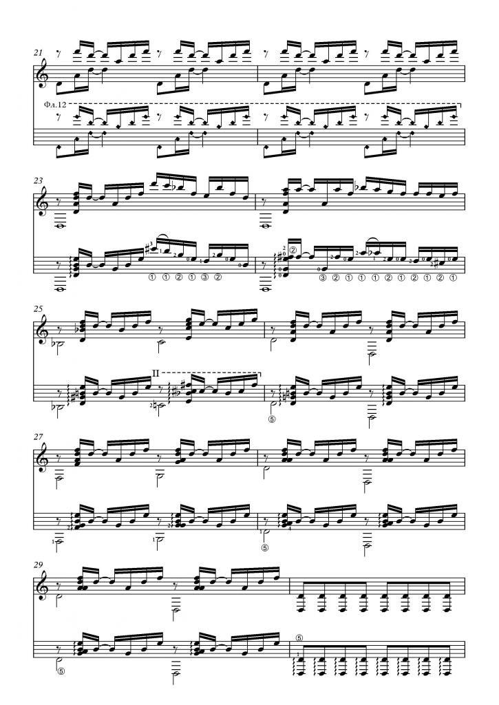 Найти удалось, написала Чеховскому в контакте, без проблем скинул ноты. Но получить ноты - не значит сыграть. Запись на две строки без таблатуры. Пришлось обращаться за дополнительными разъяснениями. Выяснила, что гитару надо перестраивать. Шестая-ре, первая-фа, вторая-ре, третья-ля, а играть по второй строчке. При этом надо забыть, что первая, вторая и третья перестроены, а о шестой помнить. В общем, треш, буду разбираться, хоть и не уверена, что получится. Первые три такта легко, дальше путаюсь. Попыталась под видео, а там разница в полтона.
