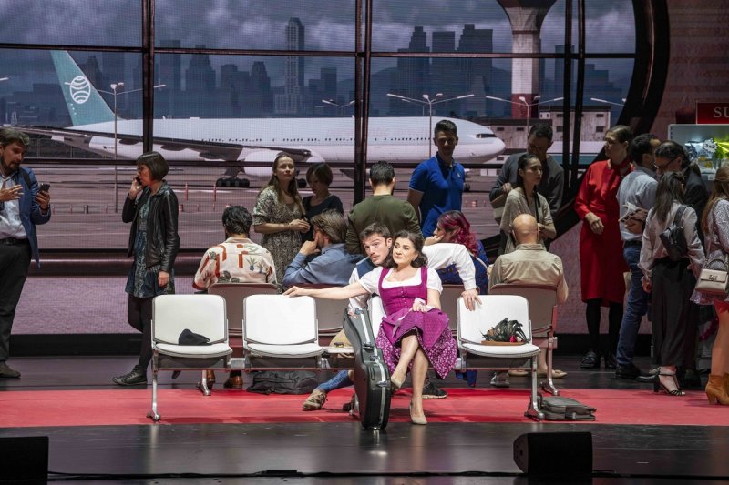 Ансамбль высококлассных солистов Моцарта застревает в аэропорту имени Лоренцо да Понте – вот отправная точка истории. В предисловии к спектаклю содержится предупреждение: «Если вам не нравится опера, немедленно покиньте помещение! Здесь нет аварийных выходов». Герои оперной трилогии Моцарта и да Понте пересекаются в аэропорту. Мы наблюдаем за яркими, непослушными пассажирами, ожидающими рейсов в Севилью, Палермо и Неаполь и сталкивающимися с забастовками, штормами, задержками, протестами и взаимными превратностями. Они начинают вести себя так, как не принято в аэропортах.