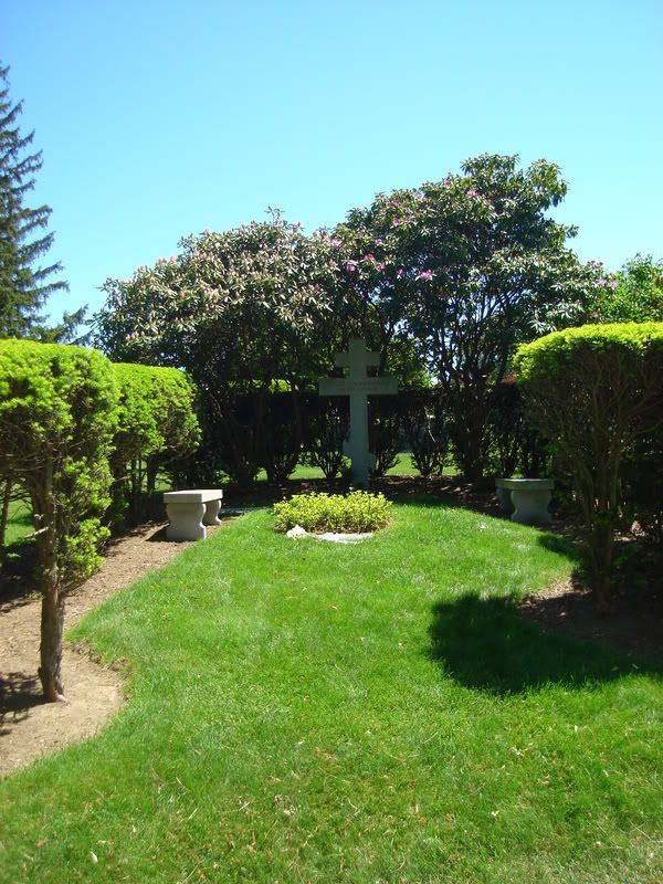 Атмосфера была действительно такая, как будто это могила, скажем, прадедушки. И захоронение было выполнено в русских традициях - вместо могильной плиты - коврик из живых растений, а над могилой - Православный Крест. Под крестом - маленькая, еле заметная табличка - "Special Care" - "Особый Уход". Рядом - огромный куст сирени. А возложить на могилу мы решили именно маргаритки - всем понятно, почему.