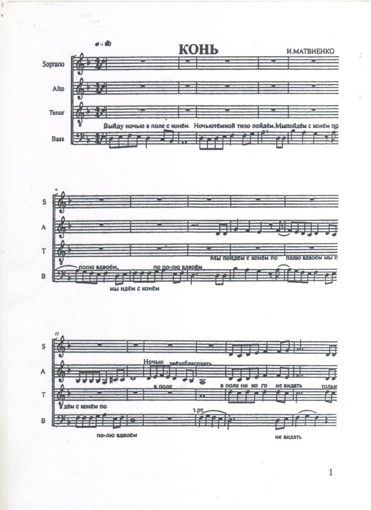 Здравствуйте друзья! Я где-то нашёл хоровую партитуру «Конь» Но скачал по ошибке только первую страницу. Ви можете мне помочь найти партитуру целиком